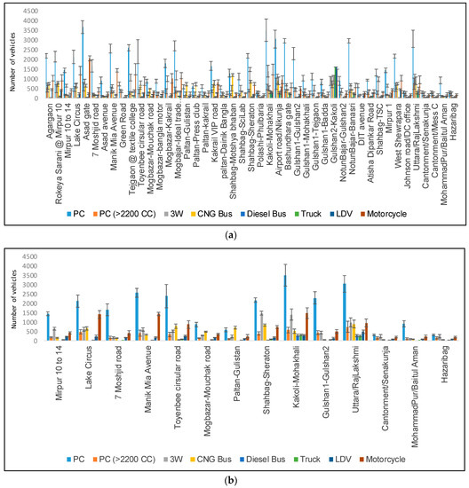 The results confirmed the dominance of private vehicles along the roads. In order to demonstrate the pattern more clearly, Figure 8b provides on-road traffic volume data for some selected roads in the city. The dominance of CNG-fuelled buses over diesel-fuelled ones might have resulted due to the lower price of CNG and available technology. The growth trend of motorcycles, as shown in Figure 1, is also reflected in Figure 8, which could become even higher with time because of increased commercial advantages and incentives.