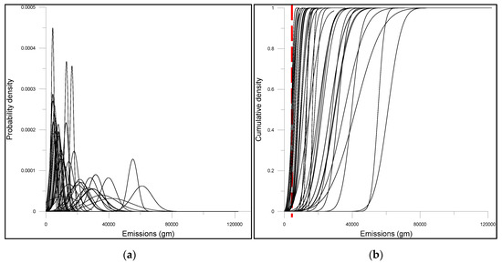 However, to simplify, the distributions were considered to be normal in this research. Hence, the calculated emissions were similarly distributed, and therefore, the probability of risk was analysed with a cumulative distribution function of normally distributed NOx emissions (Equation (3)), where emissions equivalent to the national standard or the WHO (World Health Organization) standard on the cumulative curve indicated the probability of risk: