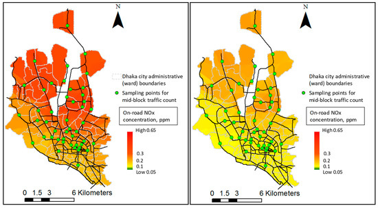- The model was run with a background NOx concentration of 0.02 ppm. This is not the exact measurement for Dhaka, but it was applied considering the relative pollution contribution of other sources [28,29] and was fractioned in relation to the national standard (0.1 ppm).