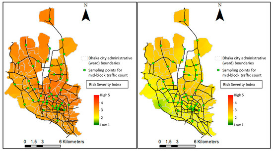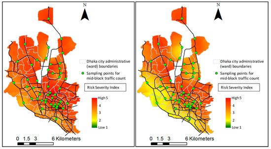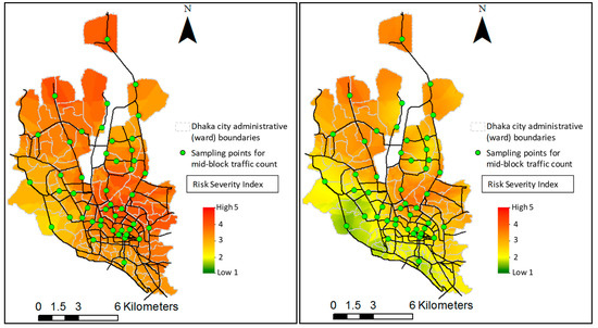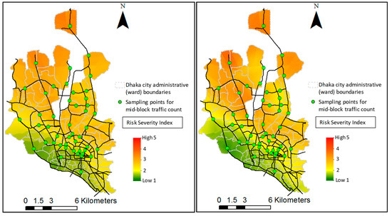 Risk severity, considering the magnitude and probability of exposure, is therefore important to demonstrate to what extent the exposure scenarios might cause the risk. The extent of risk was assessed with a risk severity matrix (outlined in the methodology section), and a probabilistic spatial distribution of calculated risks during peak and offpeak hours in Dhaka City is provided in Figure 11.