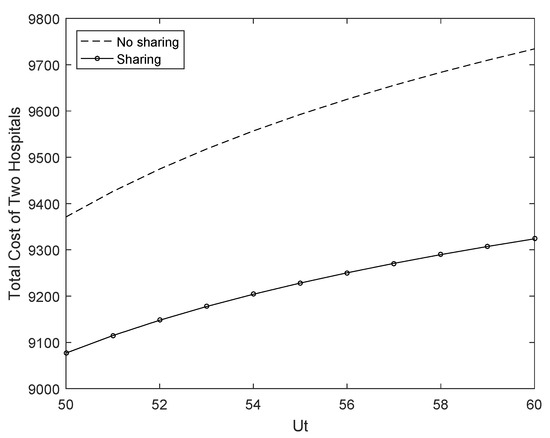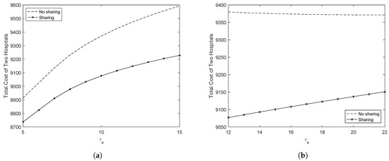 Under the sharing case, for two cooperative hospitals, when , the optimal expected total cost increases as and increase. When , the optimal expected total cost increases as and increase.