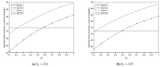 Under the no sharing case, the inventory decisions in hospital j do not affect the inventory decisions of hospital i. However, in the sharing mechanism, the two hospitals form an alliance and aim at preventing stockout with a minimal total cost. Therefore, the emergent request rate of patients in hospital j, the safety stock level of hospital j, and the order-up-to quantity of hospital j impact the decision process of hospital i. Under the condition that , inventory sharing is preferred when stockout occurs in hospital i. However, if hospital i realizes that hospital j may face an increasing (which means hospital j needs more inventory to satisfy its internal demand), then hospital i will increase its inventory level in case of the stock out. On the other hand, if hospital i is informed that the safety stock level in hospital j increases (which means hospital j wants to keep more safety stock), the possible sharing amount to hospital i will decrease. Thus, hospital i can only increase in advance in case of expensive emergent replenishment. In addition, if inventory sharing is preferred for addressing stockout, when hospital j increases the inventory level , hospital i will decrease to avoid overstock.