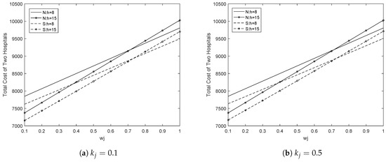 With the mathematical proof, we find that only when does a higher or increase the total cost of the alliance. In general, for the alliance of two hospitals i and j, a higher or leads to a higher sharing amount/emergent replenishment amount as well as a higher total cost. However, if h is very high (), more holding cost is saved through the sharing mechanism and can offset some cost increase caused by increasing or , and the expected total cost may not increase as and increase. Similarly, only when is satisfied does a higher make hospital j share less inventory with hospital i, then hospital i spends more on emergent replenishment. Total cost increases as increases under the above condition. If is very high, , inventory sharing is not preferred for hospital i when stockout happens. Then, has no effect on sharing action and the expected total cost. Under this case, a higher total cost of the alliance is resulted by the emergent replenishment order placed by hospital i.
