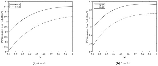 Besides, under the sharing policy, the expected total cost increased as or increased (we only show the effects of , as has a symmetric effect). To show the slight difference between Figure 4a and b, we compared the expected percentage of cost reduction under the lower case and higher case . Figure 5 shows that hospitals in the sharing mechanism saved more in costs than in the no sharing mechanism when was lower. This is obvious, since if the sharing action is preferred, a higher safety stock level will decrease the sharing amount, and hospitals will satisfy the remaining demand by emergent replenishment, causing the the total cost to be higher.