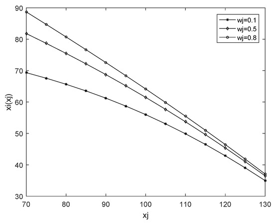 This section investigates how the hospital responded to another hospital’s inventory decision under the sharing mechanism. Figure 6 presents the response inventory level of hospital i to hospital j with different values of . Under the sharing case, if inventory sharing is economical, one hospital will decrease the inventory level if the partner hospital increases its order-up-to level. This avoids the overstock problem at the hospital. Furthermore, when the emergent request rate of hospital j was higher, although hospital i had an incentive to decrease its order-up-to level as hospital j increased its inventory level, hospital i ordered more than that in the smaller case. Overall, compared to the no sharing case, the response policy in the hospital alliance improved the utilization rate of medical inventory.