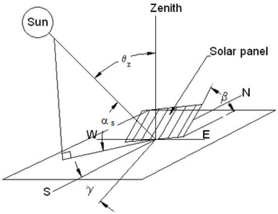 where φ is the latitude of the location, δ is the declination, ω is the hour angle, β is the tilt angle, and γ is the surface azimuth angle (Figure 1).