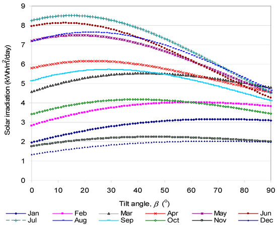 The quantity of solar energy received by a photovoltaic (PV) panel is determined by the local insolation and influenced by the orientation and tilt angle of the PV panels [2,3,4,5]. Proper installation of a PV panel, through appropriate inclination and orientation, should maximize the solar radiation received. Tracking systems that follow the course of the sun are used to maximize daily solar energy received by PV panels. However, because these devices are expensive and need energy for their operation it is recommended to find the best tilt and orientation angles. The tilt angle can be corrected from time to time, for example, seasonally [6]. Generally, it is recommended that a PV system should be installed with a tilt angle which is equal to the latitude of the site [2,7].