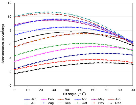 Figure 3 and Figure 4 show the average daily total solar radiation on a south-facing surface obtained using isotropic (Equation (10)) and anisotropic (Equation (16)) models when the angle of the tilt varied from 0 to 90° in steps of 1°. The optimum tilt angles and the monthly average daily total solar radiation on the optimum tilted surface are given in Table 1. Equations (10) and (16) were chosen because Badescu’s model (Equation (10)) is preferred for estimation of solar radiation incident on a tilted surface with the smallest statistical errors among all models and close agreement with measured data [59]. Similarly, the model by Steven and Unsworth (Equation (18)) has been found to be a simple model, which agrees well with integrated values of irradiance results for various locations [18].