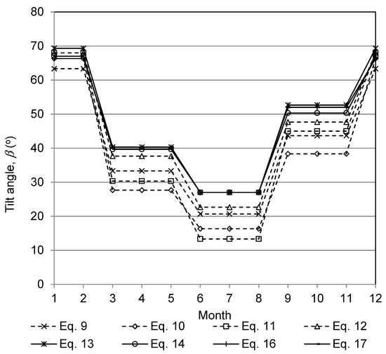 Table 4 compares the energy loss when the solar panels are adjusted seasonally with the result obtained when the tilt is kept to the yearly optimum, using isotropic models (Equations (9)–(12)). All the four isotropic models indicate that the maximum loss of energy occurs in September when using seasonally adjusted panels. The last row of Table 4 give the energy loss in July (maximum insolation) when the tilt is kept to the yearly optimum.