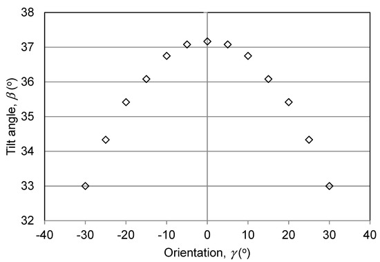 Figure 6 shows the optimal tilt angle for a given panel orientation (Equation (10)). The graph is symmetric to due south (0°), and the peak is at due south. The graph also indicates that, in case of geometrical constraints imposed by the particular building, the angle the solar panel could be installed with orientation west or east of due south for optimum output. In the case when angle deviates from due south, the panel should be adjusted to a flatter tilt.