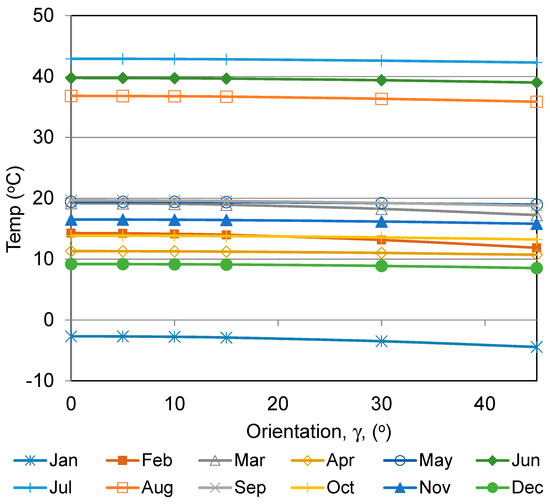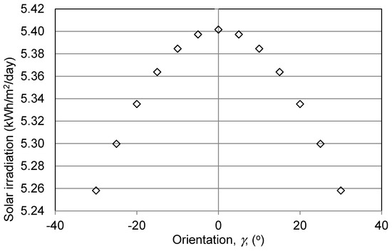 Figure 7 shows the yearly mean daily average solar radiation on a tilted surface. The graph indicates that the maximum (5.4 kWh/m2/day) solar radiation is received when the solar panels are oriented due south. This is in agreement with the results of [61]. The maximum value is reduced by 2.6% when the orientation is 30° west or east of due south (Table 6).