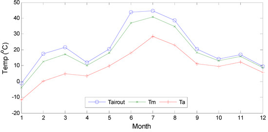 The outlet air temperature (Tairout) and the mean temperatures (Tm) were computed in Matlab® environment for the climatic data of GTA of 2011 using Equation (25) and Equation (26) using the average monthly climatic data [56].