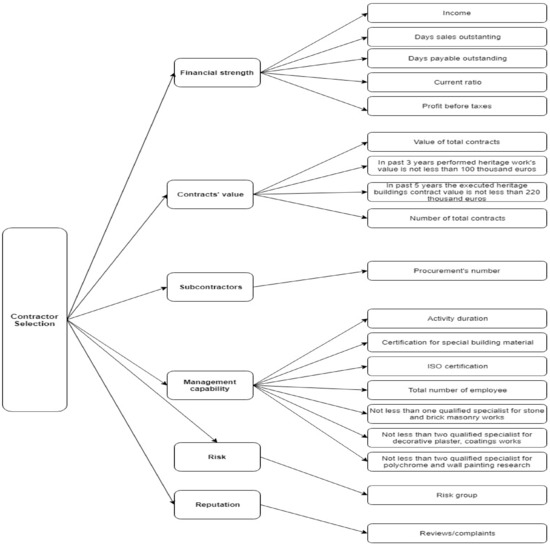 The financial strength criterion is considered, taking into account the subcriteria, such as income (x11), days’ sales (x12) and payable (x13) outstanding, current ratio (x14) and profit before taxes (x15). The contracts’ value criterion consists of total contracts’ value (x21), performed heritage work’s value (x22) (not less than 100 thousand euro), the executed heritage buildings’ contract value (x23) (not less than 220 thousand euro) and the number of total contracts (x24). The subcontractors’ criterion describes the amount of total contracts (x31). Management capability is presented by subcriteria, namely, activity duration (x41), certification for special building material (x42), ISO certification (x43), total number of employee (x44), qualified specialist for stone and bricks masonry work (x45), for decorative plaster and coating works (x46), and for polychrome and wall painting research (x47). Risk criterion shows the company’s dependence on various risk groups (from high-risk to the low-risk group) (x51). The reputation criterion presents the reviews and complains (x61) of clients and stakeholders.