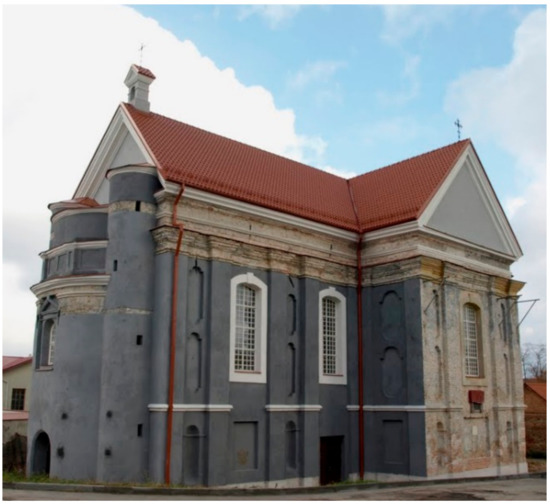 St. Stephen Church (Figure 2) was built in the late Renaissance style in the 17th century by Jesuit priest—Simonas Visockis. The church was refurbished in Classicism style in the 18th century. The church was damaged by the uprising in 1794, in 1812, and in 1863. Furthermore, the church was rebuilt by monks in 1715, in 1801–1806, in 1885–1888, and in 1893–1894. During the reconstruction works, the plan and structure of the church, the position of the main entrance and windows were changed.