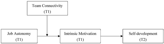 Hence, we draw on self-determination theory to explore the relationship between job autonomy and self-development. Self-determination theory states that individuals have a basic desire to determine their own behaviors [21,22,23,24,25,26]. When employees feel they have the control over their behaviors, or they could engage in certain tasks discretionally, they would be highly motivated and are more willing to work. As a comprehensive framework, self-determination theory answers the question of how to unlock a person’s full potential. It stresses individuals’ inherent tendencies toward growth and self-actualization through the satisfaction of basic psychological needs for autonomy, competence, and relatedness. Utilizing this theory as framework, our study attests to its potential for fostering sustained behavior change and wellness, and tests its generalizability in eastern culture context. Specifically, drawing from self-determination theory, we argue that job autonomy could satisfy an individual’s desire of self-determination, thus increasing their motivation to learn new knowledge and skills. We predict that job autonomy will positively influence individual’s self-development, and intrinsic motivation is the mediator in this relationship [27]. In addition, since external factors could contribute to cultivating the workplace environment as determining, we propose that team connectivity, indicating the open relationships encouraging generativity among team members which enable employees to consider the diverse influences from others as learning and growing opportunities [28,29], may strengthen the relationship between job autonomy and intrinsic motivation, and further moderates the indirect effect of job autonomy and self-employment via intrinsic motivation. Overall, our research contributes to the literature in three ways. First, we introduced the job-design perspective to self-development field and examined the predicting role of job autonomy on self-development. Second, we revealed the psychological mechanism linking job autonomy and self-development. Third, we investigated the contextual factor of team connectivity, which plays a moderating role in the relationship between job autonomy and self-development.