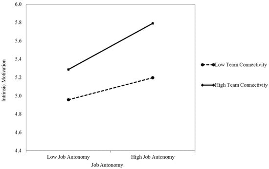 By definition, team connectivity means that the relationships between team members are open and encourage generativity, enabling members to treat their interactions as opportunities for growing and learning [28,29]. Consistent with the psychological needs one should fulfill in order to create self-determining perceptions [27,30], we posit that team connectivity could help employees to see the value of learning new things, generating new ideas, and seeking opportunities to explore and develop. First, the high team connectivity will make the employees feel that the job is effective and they could achieve valuable goals at work [34], which fulfills an employee’s psychological need of competence. Also, team connectivity implies a safe environment for employees to take risks trying new or challenging tasks, which would in turn facilitate learning and growing at work [35]. Even if they fail, the errors could be tolerated and the “trouble-makers” will be cared about. Team leader and other members will look for the underlying answers and seek for core questions in cooperative and collaborative manners. Hence, the employees may feel that they are well understood and closely related with others at work [36]. In this way, an employee’s psychological need of relatedness is satisfied. Following this, we argue that in teams with high connectivity, job autonomy tend to generate more intrinsic motivation, since employees have received more competence and relatedness at work, which in turn strengths the influence of job autonomy on intrinsic motivation. On the contrary, in teams with low connectivity, employees may feel less generativity at work and thus lower their motivation and preserve their effort. Thus, we propose:
