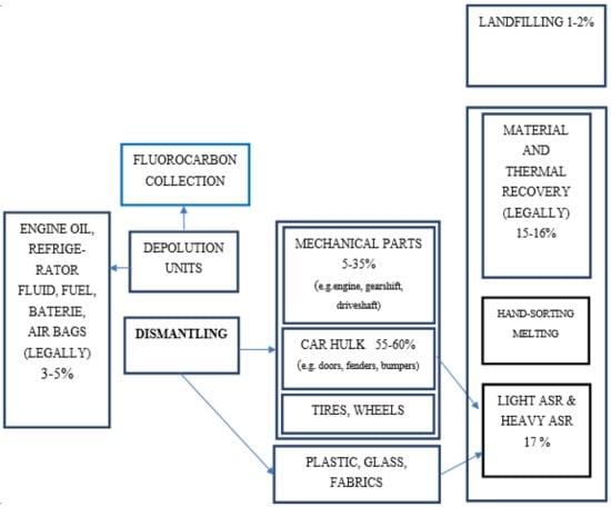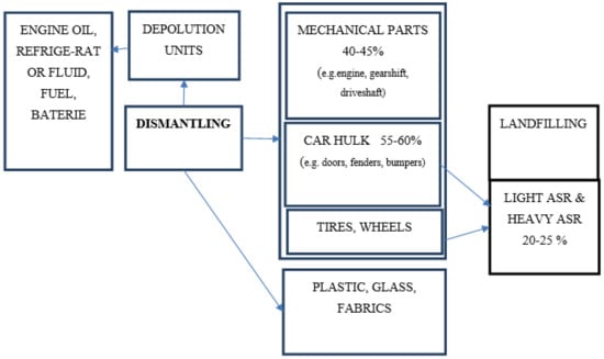 The recycling process of an ELV usually starts with the car being brought to the dismantling operator; in some cases the ELVs are bought by these operators in order to reuse or resell the functioning parts of the car. The car is dismantled into separate categories. First the components that are considered most polluting are taken out: engine oil, fuel, refrigerant gases, and car battery. They are delivered to special recycling units that are also handling the storage until they are properly disposed. After that the mechanical parts (engine, gearbox, turbine, suspension system, injectors etc.), car hulk (separated by parts: Doors, bumpers, stops, etc), tires, plastic, glass, and fabrics are collected. After dismantling of the car, the total weight of the vehicle is about 55%–70% of the original weight in EU and Japan []. What is left after dismantling is put into shredders and finally separated by air classifier into ASR light and ASR heavy. In the EU, and subsequent in Romania, the ASR represents around 12%–32%, and all is landfilled. Additionally, in Romania, tires taken from an ELV cannot be reused and for the plastic, glass and fabrics collected every dismantling operator must have an agreement with a collector unit, usually for a fee of around 500 euro per year. Air bags also cannot be resold, and they go straight to landfill all over in EU. On the other side, in Japan the Law for the Recycling of End of Life Vehicles, dictates a more profound recycling of ASR, through melting furnaces and secondary stage recycling. This way they managed to drop the percentage of ASR that is landfilled to 1%–2% of the total ELV mass [,].