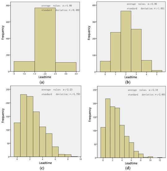Stochastic lead time distributions with different standard deviations: (a) average value and standard deviation ; (b) average value and standard deviation ; (c) average value and standard deviation ; (d) average value and standard deviation .