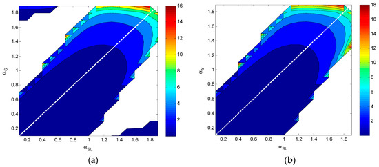 It is worth mentioning that the top left and bottom right in Figure 3a are different from those in Figure 3b. The white parts of the upper triangle and lower triangle areas of the coordinate planes in Figure 3a,b represent the large values or negative bullwhip effect values, which implies poor policies. We drew Figure 3a using MATLAB 2016a according to Equation (18), where we set the program judgement conditions about white area. In our program, the white area represents the places where the bullwhip effect value is larger than 18 or the value is negative. In fact, in Equation (18), if both its numerator and denominator are negative, the bullwhip value is incorrect. However, we omitted this condition intentionally to distinguish the two figures. When we consider the situation where both the numerator and the denominator are negative, the top left and bottom right in Figure 3a show as a white area, and the two figures remain almost same.