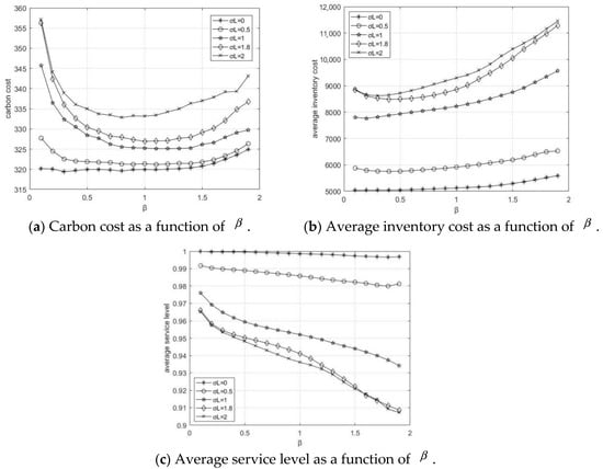 Figure 4a–c depicts carbon costs, average inventory costs, and average service levels with the system adjustment parameter under different lead times and standard deviations . It can be seen that the values of performance indicators change significantly with different uncertainty degree of the lead time. When the standard deviation of lead time increases, the average inventory cost and carbon cost decreases, while the average service level increases. However, the change patterns of the three performance indicators are different. With the increase of the parameter , the carbon cost decreases initially, and then rises smoothly. The average inventory cost is positively correlated with the parameter , while the average service level is negatively correlated with the parameter .