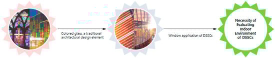 Recently, the use of windows with various colors has been a design element in architectural procedure that has been defined steadily since the Gothic style. It is also used as an architectural element in contemporary architecture to express various façades and create an interior atmosphere. As glasses in green and blue colors rather than colorless glasses are used, colored windows have been applied to make an indoor environment comfortable in addition to its design characteristics. Recent studies have been conducted to apply semi-transparent solar cells for windows through developing Dye-Sensitized Solar Cells (DSSCs) and many types of organic units. For this kind of solar cells, the element of color is essential. Although colored glasses are used in various ways, there are few performance indicators regarding the indoor environment caused by these components. In particular, the performance of the perception for color and shape accepted through the window in a room is somewhat unreasonable for designers to judge as shown in Figure 1. To compare these performance factors, this study employed the concept of color gamut used in the area of display productions. The standard visual examination table used in ophthalmology was also used as a recognition method to evaluate shape. The aim of this study was to quantify the indoor environment by windows and comparing performances between windows and DSSCs.