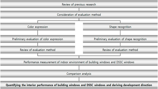 Targets for this study are clear and colorful glass windows commonly used in architectural designs for the purpose of controlling an indoor environment. DSSC windows that are being actively studied as building openings are also targets of this study. In addition to setting a control group, window applicability was examined by measuring color gamut overage used in the field of display. The process of measuring and comparing shape recognition of each window based on the visibility distance by the Landolt ring shape, a standard mark used in visual treatment, was conducted as described in Figure 2 in detail.