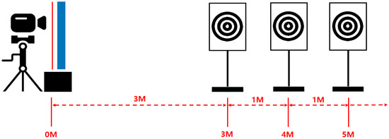 The following settings were made for the shape recognition test: installing the equipment, fixing the target, setting the environment, and operating the evaluation method. For the evaluation, Landolt rings are written in three dimensions such as C1 at 37.5 mm by 37.5 mm, C2 at 17.5 mm by 17.5 mm, and C3 at 7.5 mm by 7.5 mm. After each sample was installed on openings of the mock-up, photographs have been stored with a DSLR (Digital Single-Lens Reflex) camera from 3 m to 18 m per target sheet as explained in Figure 5.