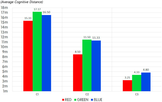 It was found that the distance for recognizing the Landolt ring was different according to the color. The average shape or distance of each product was calculated by averaging data for each sample. In the case of C1, the Landolt ring shape was not recognized at 15.33 m in red, 17.17 m in green, or 16.50 m in Blue. In the case of C2, the shape was not recognizable at 8.50 m in red, 11.50 m in green, or 11.33 m in blue. In the case of C3, the Landolt ring was not recognizable at 3.25 m in red, 4.33 m in green, and 4.80 m in blue one as shown in Figure 6.