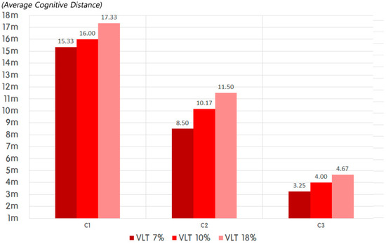 According to VLT values, it was confirmed that the distance for recognizing the Landolt ring was different. The average shape or distance of each product was calculated by averaging data for each sample. In the case of C1, the Landolt ring shape was not recognized at an average of 15.33 m for VLT at 7%, 16.00 m for VLT at 10%, or 17.33 m for VLT at 18%. For C2, the shape was not recognizable at 8.50 m for VLT 7%, 10.17 m for VLT 10%, or 11.50 m for VLT 18%. In the case of C3, the Landolt ring was not recognizable at 3.25 m for VLT 7%, 4.33 m for VLT 10%, or 4.67 m for VLT 18% as shown in Figure 7.