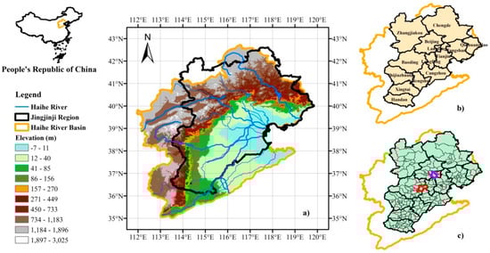 The Haihe River basin and the Jingjinji region. (a) The Haihe River Basin; (b) Cities in the Jingjinji region; (c) Counties in the Jingjinji region (the red and purple boundaries indicate the Xiong’an New District and Tongzhou District, respectively).