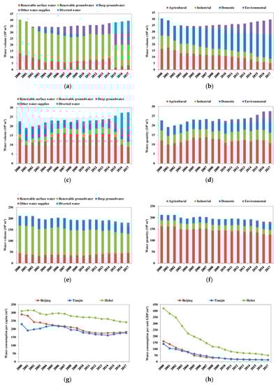 Figure 2. Water supply, consumption structures, and water use efficiency in the Jingjinji region. (a) Water supply in Beijing; (b) Water consumption in Beijing; (c) Water supply in Tianjin; (d) Water consumption in Tianjin; (e) Water supply in Hebei; (f) Water consumption in Hebei; (g) Water consumption per capita; (h) Water consumption per unit GDP. - The current socio-economic data used in the study were collected from the “Beijing District Statistical Yearbook (2016),” “Beijing Statistical Yearbook (2016),” “Tianjin Statistical Yearbook (2016),” and “Hebei Economic Yearbook (2016).” The future socio-economic scenarios are based on the “Outline of the Thirteenth Five-Year Plans for National Economic and Social Development (2016–2020),” “General Plans for Land Use,” and “General Plans for City” of cities and counties in Beijing, Tianjin, and Hebei (see Section 3.3. for details). The county boundaries were collected from the Geographical Information Monitoring Cloud Platform (http://www.dsac.cn/, which is in Chinese only).
