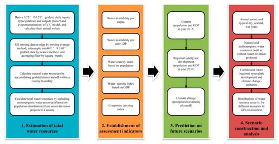 To assess water resource security and map its spatial distribution at county level in the Jingjinji region, an assessment framework is developed consisting of four major procedures (see Figure 3). These are the estimation of total water resources, establishment of assessment indicators, projection (prediction outcomes) of future scenarios, and scenario construction and analysis. For simplicity, the total water resources in a county can be regarded as the sum of natural renewable and anthropogenic water resources of that county.