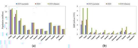 Figure 4 shows the population and GDP of 13 cities in the Jingjinji region in 2015 (current scenario), 2020, and 2030 (future scenario). The total population and GDP are projected as 123.6 million and 19.9 trillion CNY (~2.88 trillion USD) in the future scenario (see Figures S3 and S4 for the current and future distributions of population and GDP).