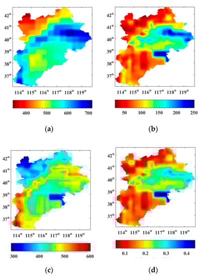 Spatial distribution of annual mean precipitation, runoff, actual evapotranspiration, and runoff coefficient in the Jingjinji region. (a) Precipitation; (b) Runoff; (c) Evapotranspiration; (d) Runoff coefficient.
