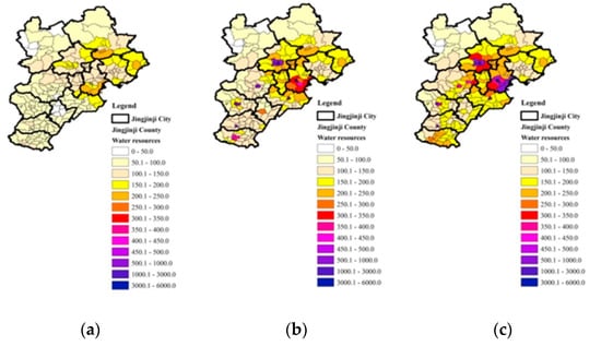 The distributions of water resource security are firstly mapped using the assessment indicators in the Jingjinji region for the current scenarios.