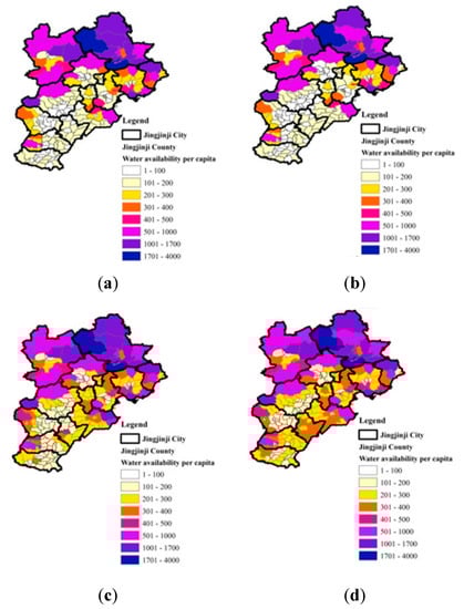Distribution of water availability per capita at county level (unit: m3). (a) Annual mean, without WDP, current; (b) Annual mean without WDP, future; (c) Annual mean with WDP, current; (d) Annual mean with WDP, future.