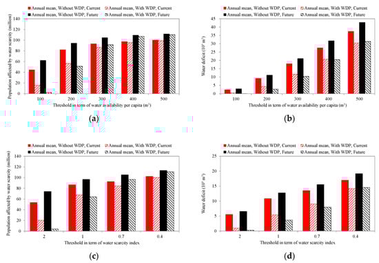 As an application example, the population affected by water scarcity and water deficit under varying thresholds in term of can be calculated with the distribution. As shown in Figure 9a,b, when the thresholds in term of are 100 m3, 200 m3, 300 m3, 400 m3, and 500 m3, before and after supplementation by the WDP, the population affected by water scarcity in the annual mean are decreased from 44.5 million, 82.0 million, 93.2 million, 97.2 million, and 100.1 million to 15.6 million, 56.4 million, 86.6 million, 95.2 million, and 98.9 million, respectively; and the water deficits are decreased from 2.35 billion m3, 9.22 billion m3, 18.00 billion m3, 27.51 billion m3, and 37.41 billion m3 to 0.51 billion m3, 4.32 billion m3, 11.59 billion m3, 20.67 billion m3, and 30.43 billion m3, respectively.