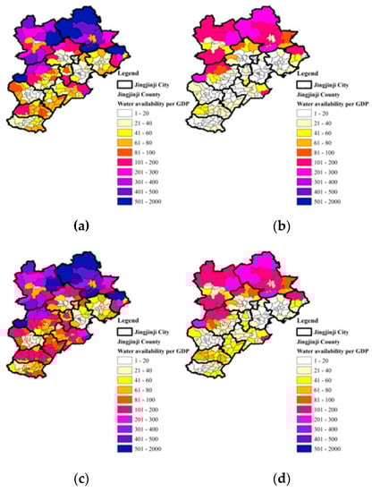 The distributions of water resource security in the Jingjinji region are then mapped according to the assessment indicators arising from projecting the future scenarios of regional synergistic development. The mapping of the annual mean is shown in Figure 7,Figure 8, Figure 10, Figure 11, Figure 12 and Figure 13 (see Figures S12–S17 for the distributions in typical years).