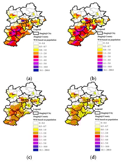Distribution of water scarcity index (WSI) based on population at county level. (a) Annual mean without WDP, current; (b) Annual mean without WDP, future; (c) Annual mean with WDP, current; (d) Annual mean with WDP, future.