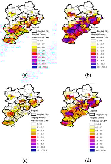 Distribution of water scarcity index (WSI) based on GDP at county level. (a) Annual mean without WDP, current; (b) Annual mean without WDP, future; (c) Annual mean with WDP, current; (d) Annual mean with WDP, future.