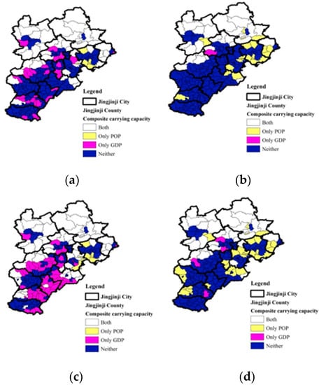 Moreover, an indicator that reflects the carrying capacity for both population and GDP (composite carrying capacity) is proposed, which can be classified as satisfying the water resource requirements of either “Both,” “Only Population,” “Only GDP,” or “Neither.” The composite indicator is calculated based on the values of the two WSI indicators with respect to their thresholds. The thresholds for both and are set as 0.7 in order to determine which class a county belongs to, allowing for a 30% environmental flow requirement [11,27,28,32]. With the composite indicator, the counties which suffer water scarcity due to the heavy burden of population or GDP can be clearly identified.