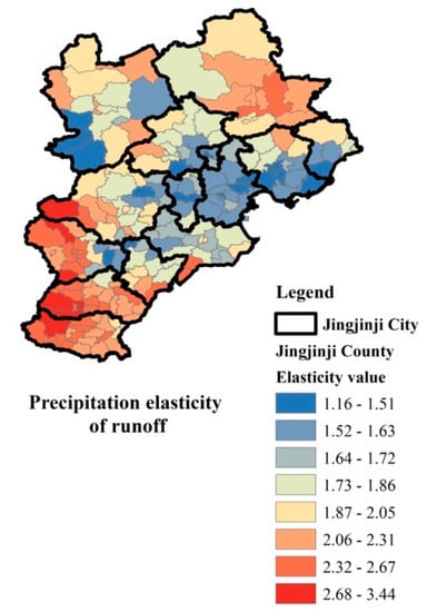 Figure 14 shows the distribution of precipitation elasticity of runoff at county level, where ranges from 1.16 to 3.44. The absolute value of is relatively large in the northern, western and southern counties, indicating that the runoff of these areas is more sensitive to change in precipitation. Particularly, much more attention should be paid to the southern counties under the climate change context because of the limited and vulnerable water resources in those counties.