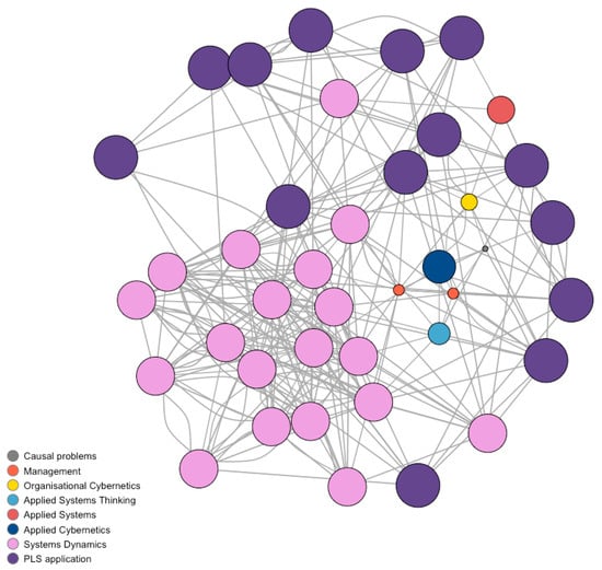 This section is intended to review the situation reported on the subject of sustainable management and to identify gaps concerning the perspectives in which it has been addressed. There are several works on sustainability management, mainly from environmental and social perspectives. The bibliometric search was carried out in SCOPUS ( academic bibliographic database) using “sustainability and systems thinking” as descriptors, considering the following search strategy: [(“sustainable” OR “sustainability” OR “wetland” OR “site RAMSAR”) AND TITLE-ABS-KEY(“organisation” OR “business” OR “enterprise” OR “management”) AND TITLE-ABS-KEY (“partial least square” OR “PLS” OR “predictive models” OR “structural equation modelling”))] in titles, abstracts and keywords. On the inclusion and exclusion criteria: articles included were those in which the scope considered the sustainable operations or systemic method in RAMSAR sites, without restrictions about countries and published from 2010–2019 and mostly in English. Articles dealing only with theoretical aspects were excluded. This resulted in a total of 80 articles, and after applying the exclusion criteria, only 40 contributions were obtained. Figure 1, shows the relationships and echo between these articles considering the approach applied by the authors (To design this figure, a node and edge list were generated in CSV format based on the information collected from Scopus. Then, these CSV files were processed in Rstudio using the igraph package and to present it, order by components was used as a plotting option). It should be noted that each document can be related to a contribution as shown in the network scheme. These relationships were established based Romero-García et al. [] to generate an overview of the type of treatment that has been given to a given problem.