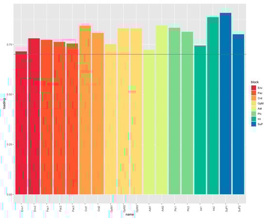 Figure 4 presents λ for each of the indicators in their respective blocks reporting on the composition and relative importance of each component in its corresponding LV []. In this model, all items obtained a λ greater than 0.7, surpassing the minimum threshold to establish a communality equivalent to 0.5, and thus confirming that each indicator explains at least 50% variance of each LV [,].
