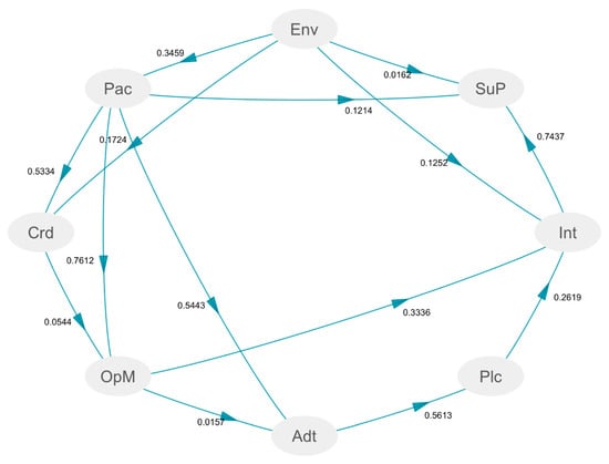 Following the statement of this proposal, the second objective was to outline a conceptual model that could be translated into VSM language for implementation. Consequently, the third objective of this study was to validate the construct using the PLS-PM by finding that the established relationships are statistically consistent and fit the context in which the participating organisations operate. Considering the results, it can be said that evidence was obtained that the environment (Env) includes more considerable significance in primary activities (Pac) or processes directly related to the organisational purpose. Consistent with what is established by organisational cybernetics, the PLS-PM showed that the relationship between the Pac and the elements of coordination, management, intelligence and policy development affect the ability to operate sustainably, as well as these relationships, affect the adaptive capacity and equilibrium of the system.