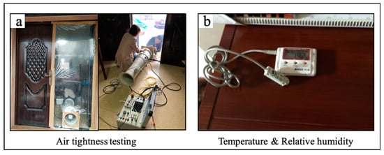 Field measurements: (a) air-tightness testing and (b) temperature and relative humidity measurement.