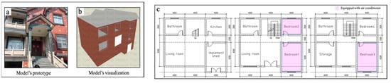 In this study, a base model was built for the prototype of a three-story house in Anji County with the DesignBuilder software. Figure 2 shows the visualization and layout of the base model. The indoor thermal environment and energy consumption of the base model were simulated with the EnergyPlus software. The conduction transfer function (CTF) algorithm was used for calculation. The specific construction of the building’s envelope was set according to the results of questionnaires and on-site inspection. The properties of each material were obtained from EnergyPlus software. Table 1 presents the thermal properties of the base model’s envelope. The window-to-wall ratios (WWRs) in the southern and northern directions were 15.87% and 12.93%, respectively. There were no external windows in the eastern and western directions. In addition, ACH was set to 1.5 h-1 based on the results of the air-tightness test. Based on the results of the questionnaire surveys, the heating and cooling periods were set to be 8:00 a.m. – 12:00 p.m. for November 21–February 10 and 5:00 p.m.–8:00 a.m. for June 11–September 30, respectively. The heating and cooling temperatures were set to 22 °C and 26 °C, respectively. In addition, in order to better verify the simulation results and the measured results, the outdoor temperature and humidity data used in the simulation of this study are derived from the measured results.