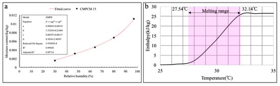 (a) Isothermal equilibrium moisture content curve and (b) Temperature–enthalpy curve of CMPCM-15.