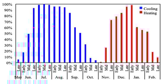 Up to 89% of the houses were equipped with air conditioners for heating and cooling. More than 85% of the households chose to use air conditioning for cooling from late June to early September, and more than 70% of the households used it for heating from late November to early January, as shown in Figure 4. The demand for cooling in the summer was much higher than the demand for heating. The average household electricity fee was 139.2 Chinese yuan (CNY) per month, and the average household gas fee was 75 CNY/month. According to the China Family Panel Studies, if an average of roughly four residents per rural household is assumed, a rural household in China would require 90 kWh/month to meet basic needs []. Thus, the monthly electricity fee for a rural household in China would be 55 CNY/month. Therefore, the energy consumption fee is relatively high for rural houses in the HSCW zone.