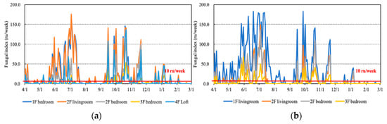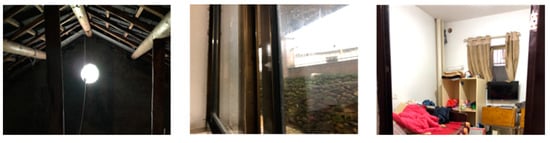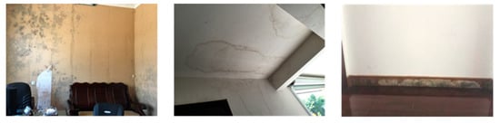 Figure 7 shows the calculated fungal index of the two houses. The fungal index was always greater than 10 ru/week for both houses, which indicates a high possibility of fungal contamination. Table 3 presents the percentage of the whole year when the fungal index was 10 ru/week or more and the relative humidity was 70% or more. All rooms of House B had a higher possibility of fungal contamination than House A, except for the 2F living room. Most rooms of House B had a higher fungal index than the rooms of House A, especially in the summer. This is because House A used the air conditioner longer than House B in the summer. Thus, House A generally had a lower relative humidity than House B. During other times, House B and House A had very similar values for the fungal index. Figure 8 shows some of the moisture damage, which was very common in the rural houses of this area. The results of the interviews validated the calculated results with the fungal index and indicated very serious fungal contamination of rural houses in this area.